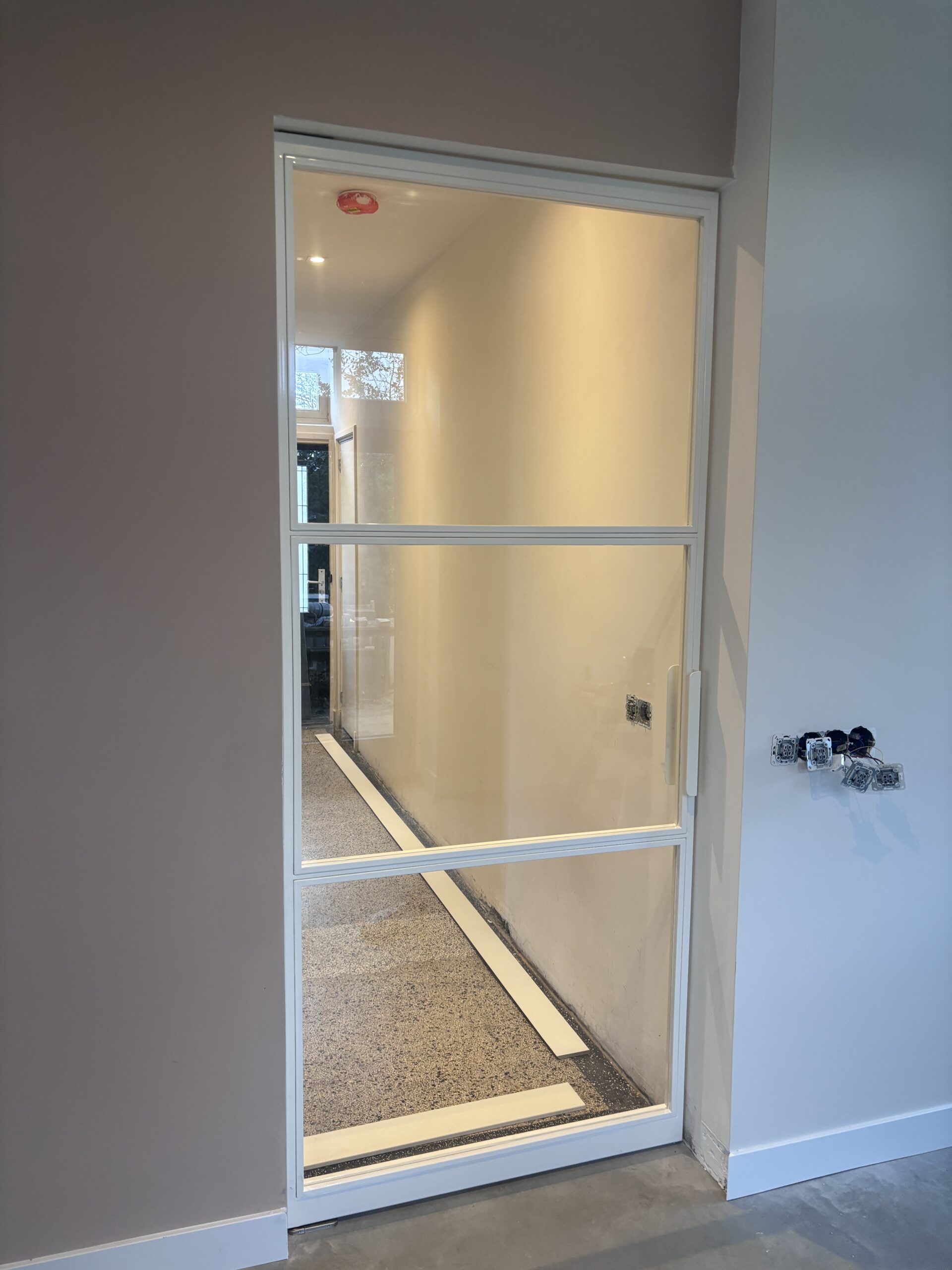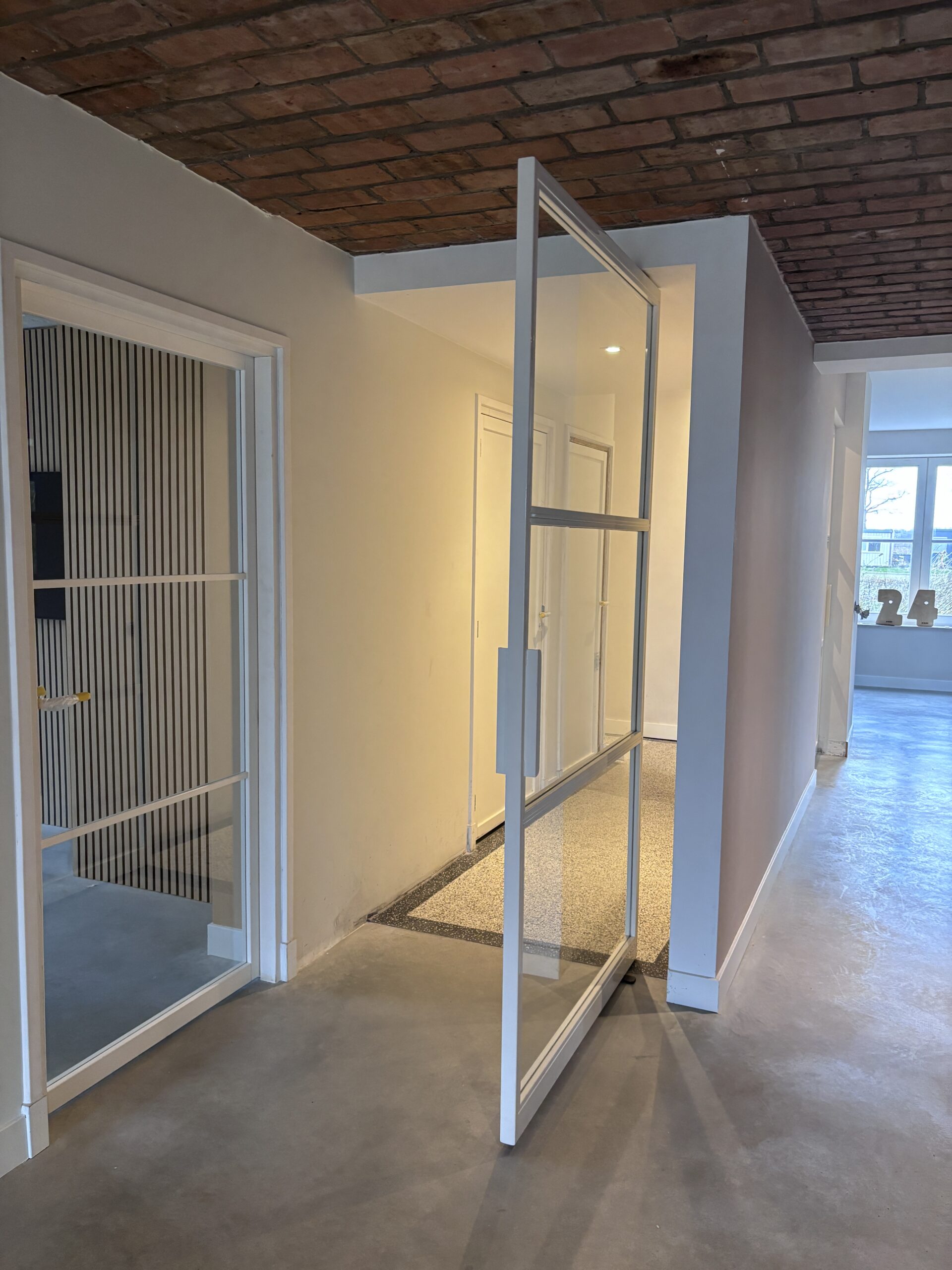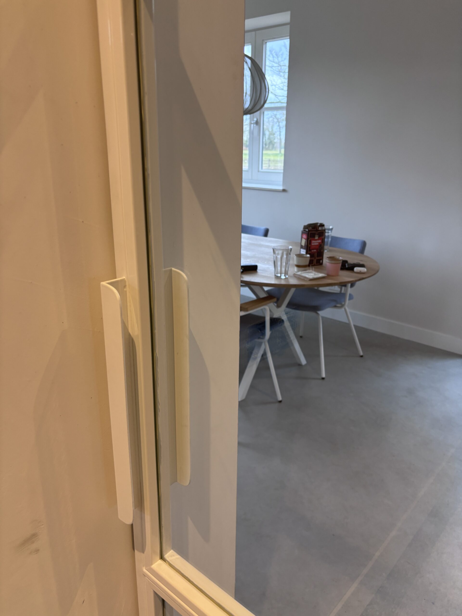 Witte stalen taatsdeuren met vakverdeling en bijpassende handgrepen – strak, functioneel en op maat gemaak
